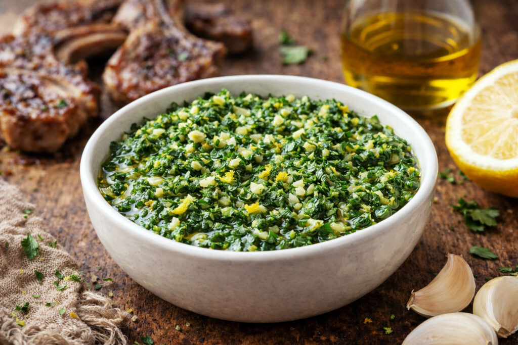 Parmi les condiments stars de la cuisine italienne, la gremolata mérite clairement plus de love ! Dans cette version revisitée, on met en avant la vivacité du citron, la pointe piquante de l’ail et la fraîcheur du persil plat, liés par un bon filet d’huile d’olive. Une sauce simple, mais redoutablement efficace pour réveiller une viande grasse comme l’agneau. Si vous cherchez une sauce pour des côtelettes d’agneau grillées, c’est un match parfait ! Le bonus ? Pas de cuisson, que du peps.