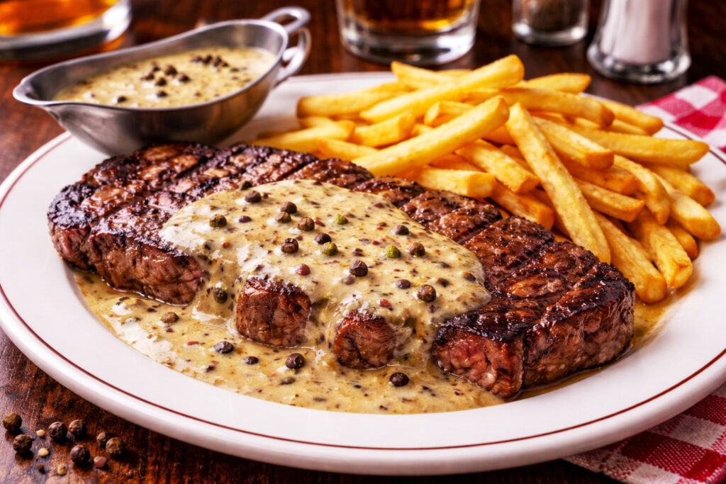La peppercorn sauce est une sauce emblématique des steakhouses américains. Crémeuse, généreuse et intensément parfumée au poivre, elle accompagne parfaitement un steak grillé, une entrecôte ou un filet mignon.