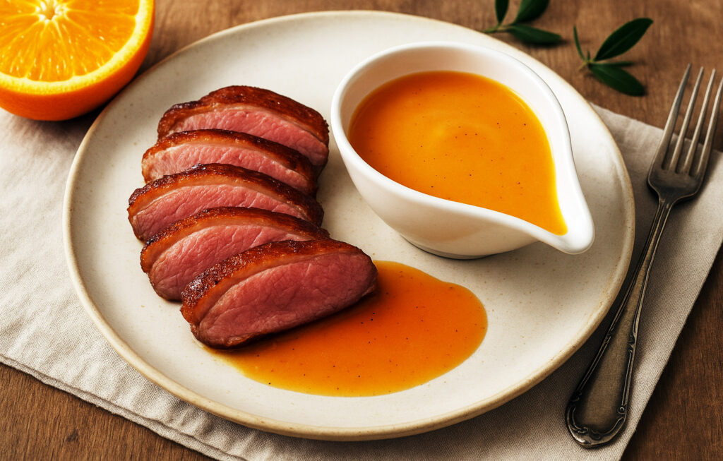 La sauce à l’orange est un grand classique de la cuisine française, souvent associée au canard. Proche de la sauce gastrique, elle repose sur un jeu d’équilibre entre le sucre caramélisé et une acidité maîtrisée, ici apportée par l’orange et un trait de vinaigre. Bien réalisée, elle est brillante, nappante, intensément parfumée, sans jamais être écœurante. Cette version met en valeur le goût naturel de la viande tout en apportant fraîcheur et élégance à l’assiette.