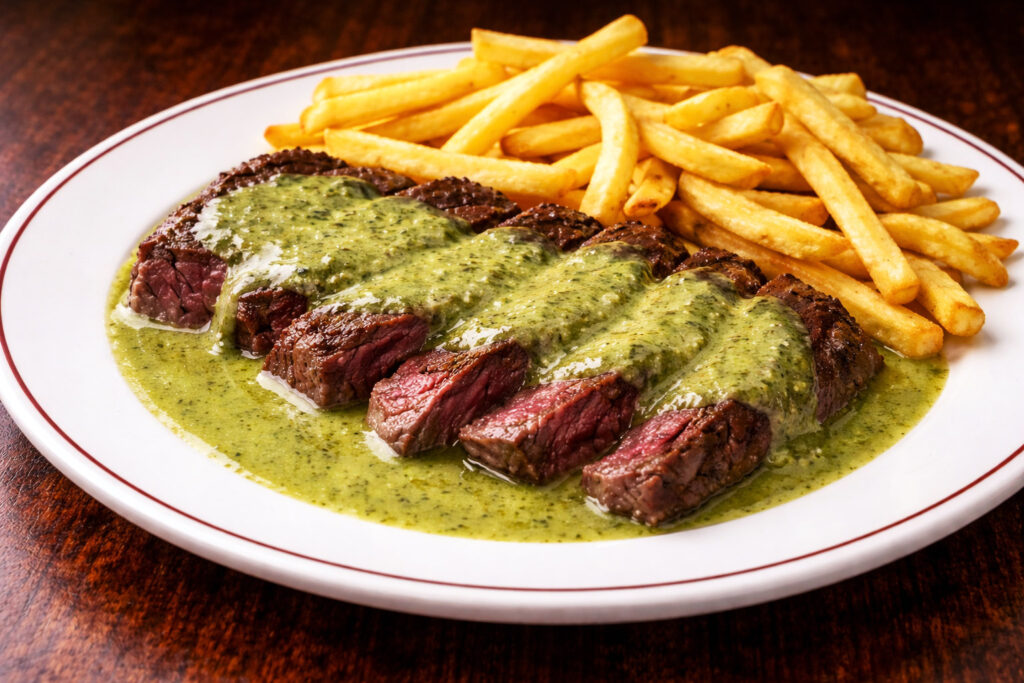 La sauce servie au Relais de l’Entrecôte est l’une des sauces les plus célèbres de la cuisine parisienne. Créée dans les années 1950, elle accompagne la célèbre formule unique du restaurant : entrecôte servie avec une sauce verte et des frites.