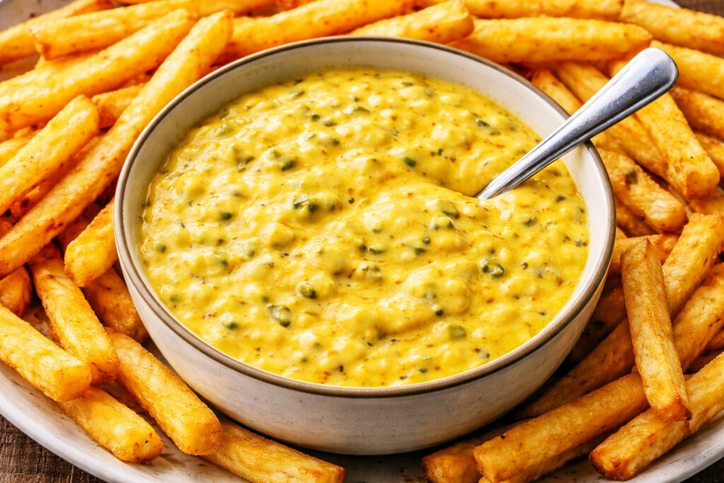 Cette base donne à la sauce sa texture légèrement croquante, sa couleur jaune et son goût caractéristique. Mélangée à de la mayonnaise, elle devient une sauce à la fois crémeuse, fraîche et parfaitement adaptée aux frites et aux snacks.