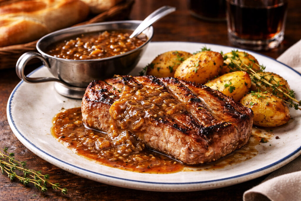 La sauce Robert est une grande sauce classique de la cuisine française, connue pour accompagner les viandes de porc grillées ou rôties. Elle se caractérise par une base d’oignons revenus, déglacés au vin blanc, enrichis d’un fond brun et relevés à la moutarde.