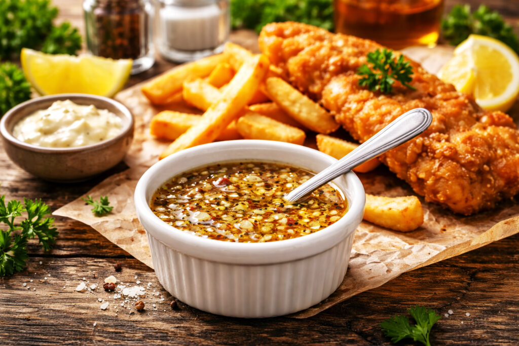 Plus doux et fruité que le vinaigre de malt, le vinaigre de cidre apporte une acidité équilibrée, idéale pour accompagner un fish & chips sans masquer le goût du poisson. Cette vinaigrette légère, peu grasse et rapide à préparer, permet d’assaisonner délicatement le poisson, les frites ou même une salade servie en accompagnement. Une option simple, fraîche et accessible pour varier des classiques anglo-saxons.